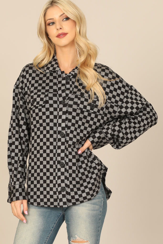 Get ready to elevate your style with our Checkered Long Sleeve Button Down Jacket. Its classic checkered design adds sophistication to any outfit, while the button down feature offers versatility for a casual or formal look. Stay comfortable and stylish no matter the occasion.