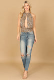 Transform your look with this LEOPARD HALTER NECK DEEP CENTER FRONT CUT-OUT TOP. The halter neck adds a touch of elegance, while the deep center front cut-out offers a stylish and daring element. Stand out from the crowd and make a fashion statement with this chic and trendy top.