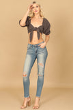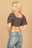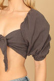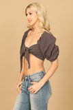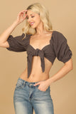 Elevate your casual look with our PUFF SLEEVE FRONT KNOT CROP TOP. The puff sleeves and front knot add a touch of sophistication, while keeping you on-trend. Perfect for any occasion, this top is both stylish and comfortable. Upgrade your wardrobe today!
