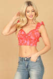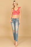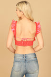 Upgrade your wardrobe with our Ruffle Lace Sleeve Floral Smocked Crop Top. The elegant ruffle lace sleeves add a feminine touch, while the smocked design provides a comfortable and flattering fit. Perfect for any occasion, this top will make you stand out with its effortless style.