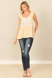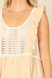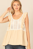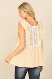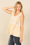 This Ruffle Sleeveless Lace Front Detail Pleated Waist Top adds a touch of elegance to any outfit with its intricate lace and delicate ruffle details. The pleated waist provides a flattering fit, making it a versatile and stylish addition to your wardrobe. Pair it with jeans for a casual look or dress it up with a skirt for a more formal occasion.