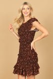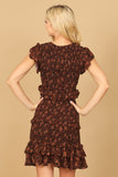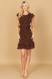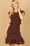 This dress is designed with a charming ruffle detail along the sleeves and a smocked waist for a comfortable fit. The unique print adds a touch of fun to this versatile piece. Effortlessly transition from day to night with this stylish and easy-to-wear dress.