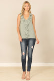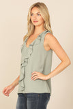 Introducing our Sleeveless Ruffle Detail Solid Top. Stay stylish with this playful and flowy top that features charming ruffle details. Perfect for any occasion, dress it up or down for a versatile wardrobe addition. Stay unique and trendy with this must-have top.