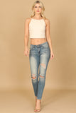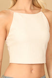 This versatile crop top is a must-have for your wardrobe. With its textured material and spaghetti straps, it adds a touch of style to any outfit. Perfect for a casual day out or a night on the town, this top is both comfortable and fashionable.