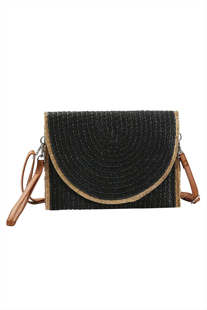This versatile clutch is perfect for any occasion. Made with a unique frayed trim and two tone straw design, it can be used as a clutch or crossbody. The perfect combination of style and functionality.