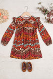 This cute dress is perfect for your little one! It features a shirring detail and ruffles along the neckline and long sleeves. Plus, it is printed with a fun animal pattern for a stylish look.