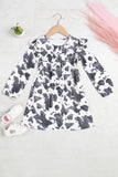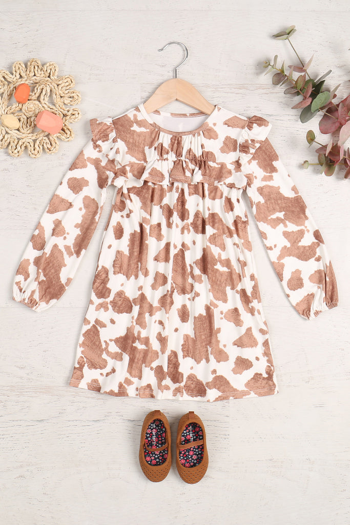 A cute and fun dress for kids featuring animal prints, shirring ruffle details, and long sleeves. Perfect for playtime or special occasions!