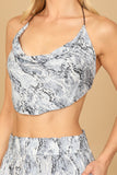 Elevate your style with our Cowl Neck Halter Snake Print Top and Pants Set! The cowl neck offers a chic touch, while the halter design adds a modern flair. The snake print adds a statement element. Perfect for a fashionable and effortless look.