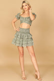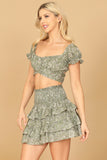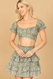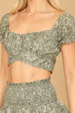 Introducing the perfect spring/summer outfit - the Floral Puff Sleeve Cross Crop Top & Ruffle Skirt Set! Made with a beautiful floral pattern and delicate details, this set will keep you on-trend and feeling confident. The cross crop top and ruffle skirt add a playful touch, making this a must-have for any fashion-forward individual. Upgrade your wardrobe with this stylish and versatile set.