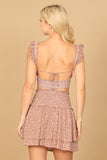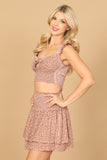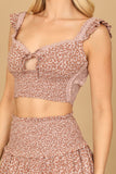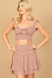 Elevate your summer wardrobe with our Floral Ruffle Front Cut-Out Shirring Top & Skirt Set. The delicate floral design and ruffle details add a touch of femininity, while the cut-out shirring top and skirt provide a flattering silhouette. Perfect for any occasion, this set is a must-have for every fashion-forward individual.