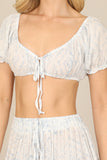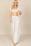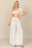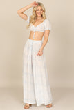 This matching set features a printed Swiss dot pattern, short puff sleeves, and a flattering waist tie. Perfect for a summery day out, this set will keep you looking stylish and comfortable. Embrace your feminine side with this bralette top and wide-leg pants combo.