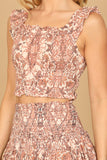 This printed top smocked ruffle skirt is the perfect addition to your wardrobe. The smocked waistband provides a comfortable fit, while the ruffle detailing adds a touch of femininity. Made with high-quality materials, this skirt is both stylish and practical for any occasion.