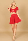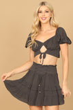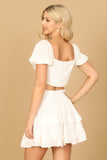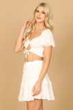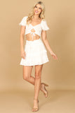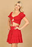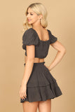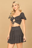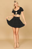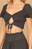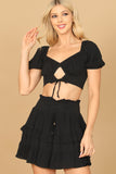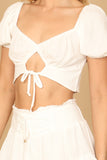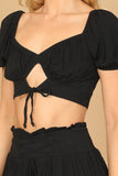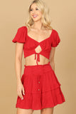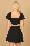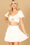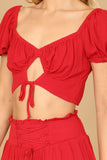 Add a touch of flirty and feminine to your wardrobe with our PUFF SLEEVE FRONT CUT-OUT CROP TOP RUFFLE SKIRT set. The unique cut-out design and ruffle details add a playful twist to this must-have outfit. With its versatile style, this set is perfect for any occasion.