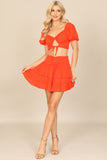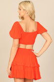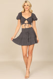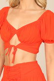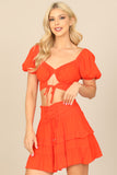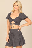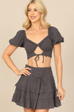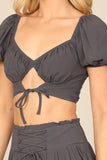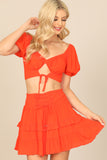Create a stylish look with our Puff Sleeve Front Cut-Out Crop Top & Ruffle Skirt Set. The puff sleeves add a touch of femininity while the cut-out detail adds a modern twist. The ruffle skirt adds movement and charm. Perfect for any occasion!