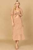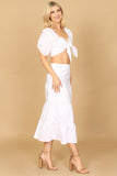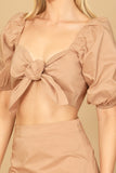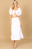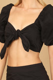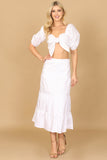 Get ready to elevate your summer wardrobe with our PUFF SLEEVE KNOT FRONT SOLID CROP TOP & SKIRT SET. The puff sleeves and knot front add a touch of femininity and the solid color makes it easy to mix and match. Stay stylish and comfortable with this must-have set.