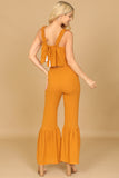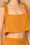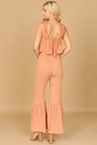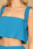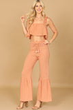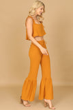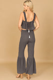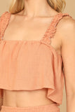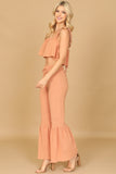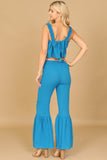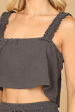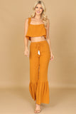 This stylish set includes a flowy crop top and coordinating flounce pants, both adorned with ruffle strap detailing. Perfect for a casual summer look or dressed up for a special occasion, this set will keep you comfortable and on-trend. Elevate your wardrobe with this must-have ensemble.