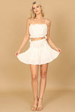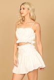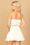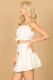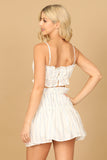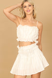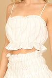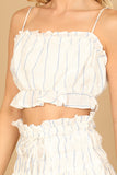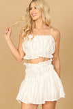Elevate your summer style with our SPAGHETTI STRAP STRIPE TOP RUFFLE SKIRT. The spaghetti straps and ruffle skirt add a touch of femininity to the classic striped pattern. Perfect for those warm days, this top promises to keep you cool and on-trend.