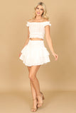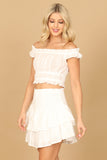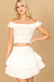Effortlessly chic and summer ready, our SWISS DOT OFF SHOULDER CROP TOP features a smocked design for a comfortable and flattering fit. Paired with the SMOCKED RUFFLE SKIRT in a matching Swiss dot pattern, this set is perfect for any occasion. Get ready to turn heads with this must-have ensemble!