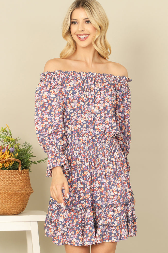 Elevate your style with our FLORAL OFF SHOULDER ELASTIC WAIST LONG SLEEVE RUFFLE DRESS. Its beautiful floral pattern, off-shoulder design, and elastic waist provide a flattering and comfortable fit. Perfect for any occasion, this dress will have you looking and feeling your best.