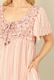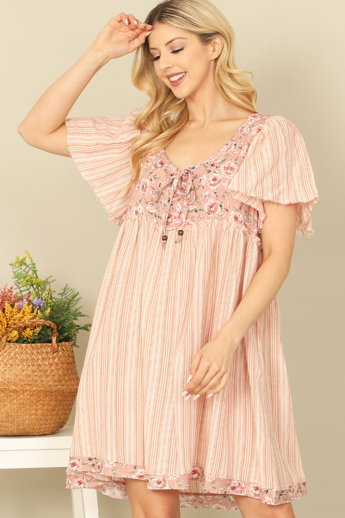 Effortlessly chic and feminine, our Floral-Stripe Print Bell Sleeve Tie Detail Babydoll Dress is the perfect addition to your wardrobe. The vibrant floral-stripe print adds a touch of whimsy, while the bell sleeves and tie detail create a flattering silhouette. Embrace springtime in style with this must-have dress.