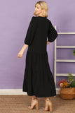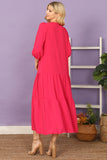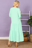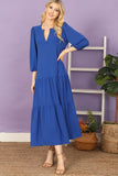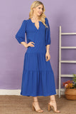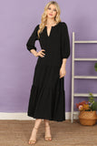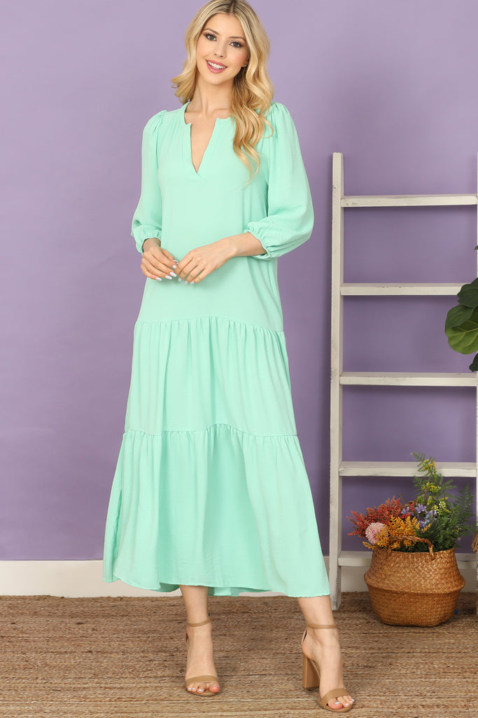 This maxi dress features a flattering notch neckline and elegant tiered ruffle details. With long sleeves and a solid color, it's perfect for any occasion. Made from high-quality fabric, this dress will keep you comfortable and stylish all day long.