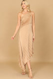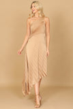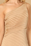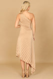 Upgrade your wardrobe with our ONE SHOULDER ASSYMETRICAL HEM PLEATED DRESS. Show off your unique style and stand out in this elegant and versatile dress. The one shoulder design and asymmetrical hemline add a touch of sophistication, while the pleated details create a flattering silhouette. Perfect for any occasion, this dress will make you feel confident and stylish all day long.