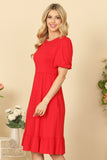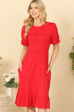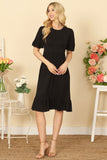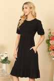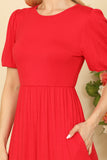 Effortlessly chic, this solid dress features on-trend puff sleeves and functional side pockets. The cinched waist adds a flattering touch, making it a must-have for any wardrobe. Stay stylish and comfortable all day long with this versatile and easy-to-wear dress.