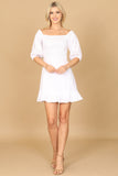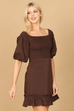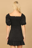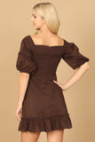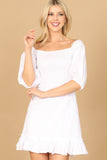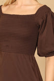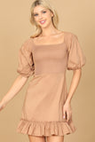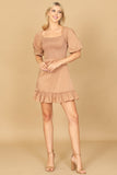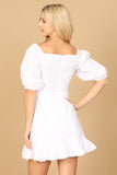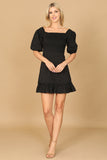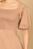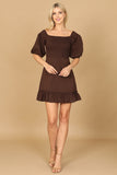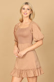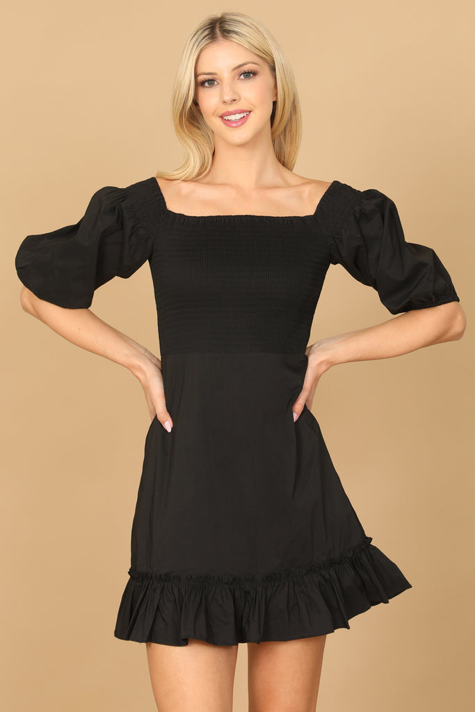 This dress features charming puff sleeves, a stylish smocked design, and a flirty ruffle hem. Its solid color allows for versatile styling options. With its comfortable fit and stylish details, this dress is perfect for any occasion.