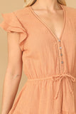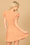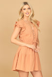 Elevate your wardrobe with our Ruffle Cap Sleeve Button Detail Waist Tie Mini Dress. The delicate ruffle cap sleeves and waist tie add a touch of femininity, while the button detailing adds a subtle yet sophisticated touch. This dress is perfect for any occasion, giving you a flattering and stylish look.