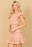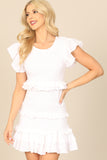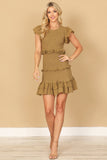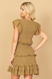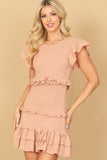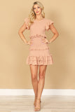 TIE STRAP SMOCKED RUFFLE NECK TIERED SOLID MINI DRESS