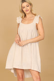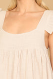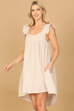 This versatile dress features fluttery ruffled sleeves and convenient side pockets, perfect for any occasion! The high-low hem and babydoll silhouette offer a playful and flattering look. Stay stylish and organized with this must-have addition to your wardrobe.