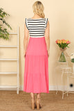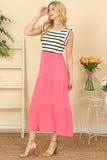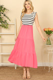 This dress is perfect for any occasion with its ruffle sleeves, bold stripes, and contrasting solid color. You'll love how it effortlessly flatters your figure while keeping you stylish. Get ready to turn heads and receive compliments all day long.