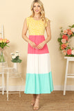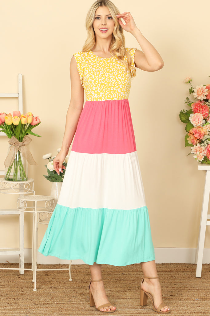 Transform your wardrobe with our Ruffle Sleeveless Leopard Contrast Color Block Maxi Dress. Featuring eye-catching ruffles, a playful leopard print, and striking contrast color blocking, this dress is both stylish and comfortable. Elevate your look with ease and make a statement wherever you go.
