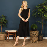 This sophisticated sleeveless midi dress features elegant tiered ruffles and a solid color for a timeless look. The flowy cut and lightweight fabric provide comfort and versatility for any occasion. Elevate your wardrobe with this chic and feminine piece.