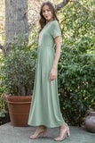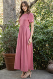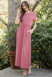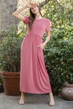 Achieve effortless style with our Short Sleeve Cinch Waist Solid Maxi Dress. The cinched waist creates a flattering silhouette while the short sleeves keep you cool and comfortable. Perfect for any occasion, this dress will become a staple in your wardrobe.
