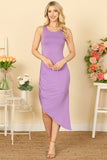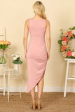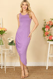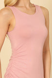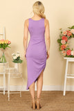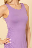 This versatile dress features a stylish asymmetrical design, with a modern side ruched detail for a flattering silhouette. The sleeveless design is perfect for warmer weather and the solid color makes it easy to dress up or down. A must-have for any wardrobe.