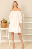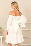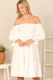 Elevate your style with our Smocked Off Shoulder Puff Sleeve Dress. Featuring a flattering smocked waist, trendy off shoulder design, and playful puff sleeves, this dress is both chic and comfortable. Complete the look with our back tie feature for a touch of elegance. Perfect for any occasion.