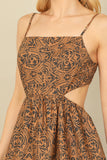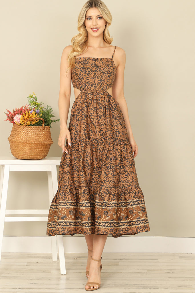 This midi dress features a trendy side cut-out design with a tie-back and spaghetti straps, perfect for any occasion. The printed pattern adds a pop of style while the midi length keeps it appropriate for any event. Show off your fashion sense with this playful and comfortable dress.