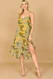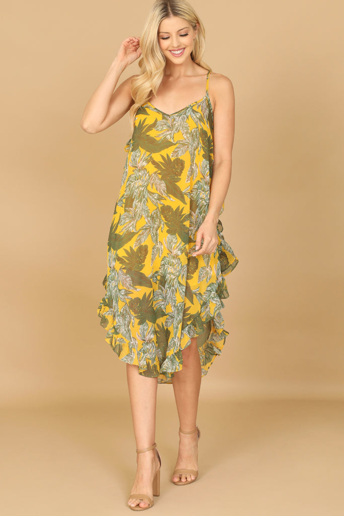 Step out in style with our playful Spaghetti Strap V-Neck Curve Ruffle Hem Leafy Dress. The flattering v-neck design, delicate spaghetti straps, and unique ruffle hem will make you the talk of the town. Don't blend in with the crowd, stand out in our quirky and fun dress.