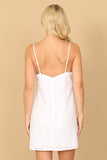 This V-Neck eyelet mini dress is perfect for summer days and nights. With adjustable spaghetti straps, it offers a comfortable and flattering fit. The eyelet detailing adds a touch of femininity, while the mini length is playful and versatile. Embrace your carefree spirit in this stylish dress.