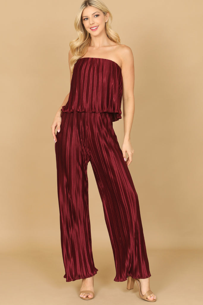 Upgrade your wardrobe with our versatile TUBE RUFFLE PLEATED SATINY JUMPSUIT. Perfect for any occasion, this jumpsuit features a flattering tube top design, trendy ruffle details, and a pleated satin fabric that will have you looking stylish and feeling comfortable. A must-have for any fashion-forward woman.