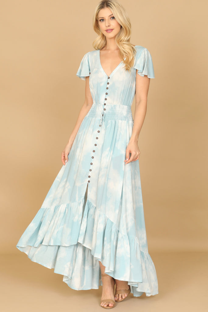 Embrace your free-spirited style with our V-Neck Button Detail Ruffle Sleeve Hi-Low Hem Tie Dye Maxi Dress. The lightweight fabric and flowy design provide a comfortable and flattering fit, perfect for any occasion. The tie-dye print adds a touch of bohemian flair to this versatile dress.