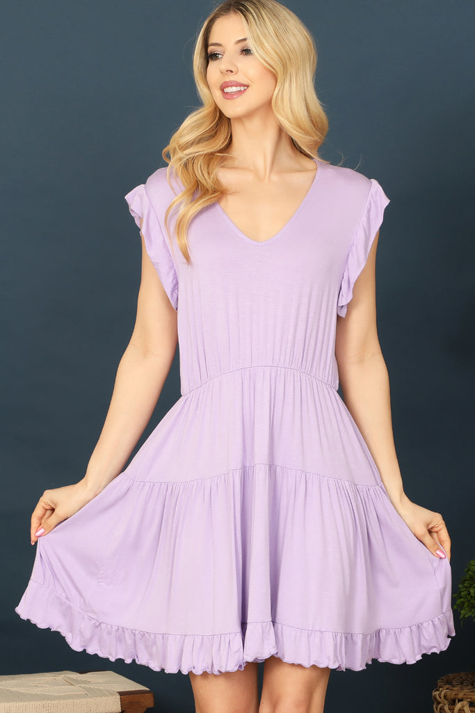 Upgrade your wardrobe with our V-Neck Ruffle Cap Sleeve and Hem Tiered Dress. Featuring a flattering v-neckline and stylish ruffle detailing on the sleeves and hem, this dress is perfect for any occasion. Its tiered design adds dimension and flow to your outfit. Elevate your style with this versatile and elegant dress.