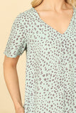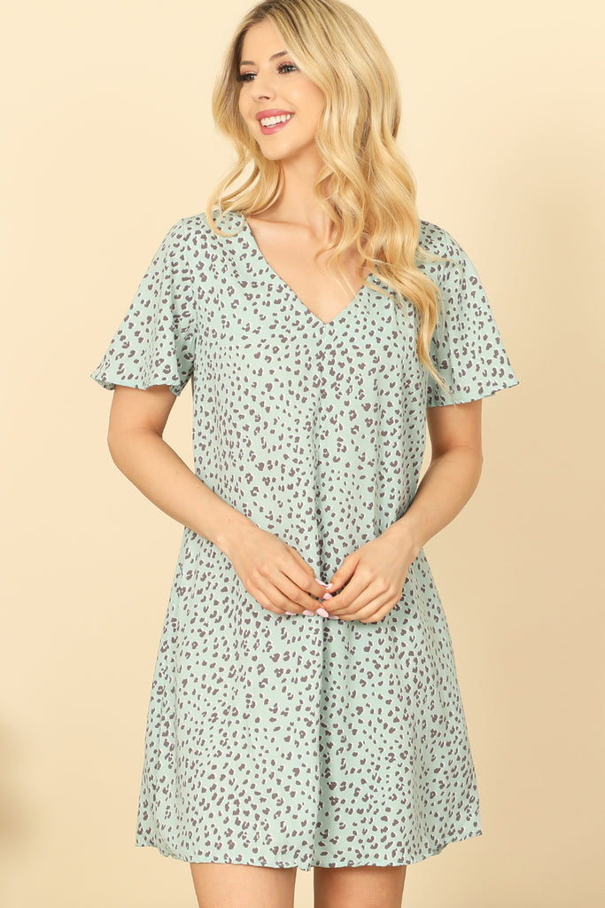 Stand out in style with our V-neck short sleeve animal print mini dress. This dress features a flattering V-neckline and short sleeves, as well as a fun and bold animal print to add a touch of personality to your wardrobe. Perfect for any occasion, this mini dress is a must-have for any fashion-forward individual.