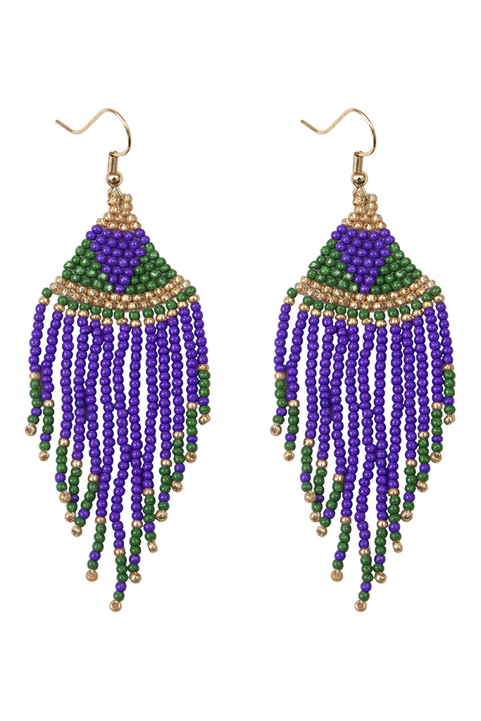 Make a bold statement with these Mardi Gras seed bead fringe tassel hook earrings. Fun yet sophisticated, they're perfect for adding a touch of drama to any look.