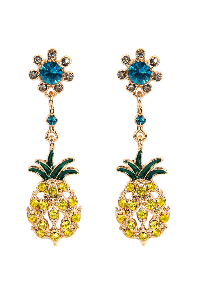 Add a touch of glam to your outfit with our Pineapple Rhinestone Dangle Earrings. The sparkling rhinestones and playful pineapple design make for a fun and stylish accessory. Perfect for any occasion, these earrings are sure to make a statement.