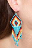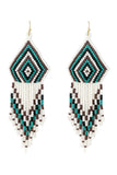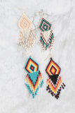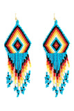"Add some western flair to your wardrobe with these unique geometric fringe earrings, adorned with colorful seed beads. Perfect for making a statement and adding a touch of playfulness to any outfit!"
