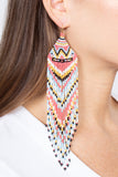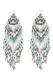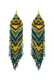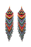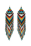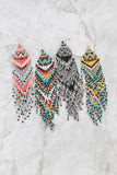 Add a pop of color and style to your outfit with these Western style Aztec seed bead fringe drop earrings. The unique design and bold colors will make you stand out from the crowd. Elevate your look with these statement earrings that are perfect for any occasion.