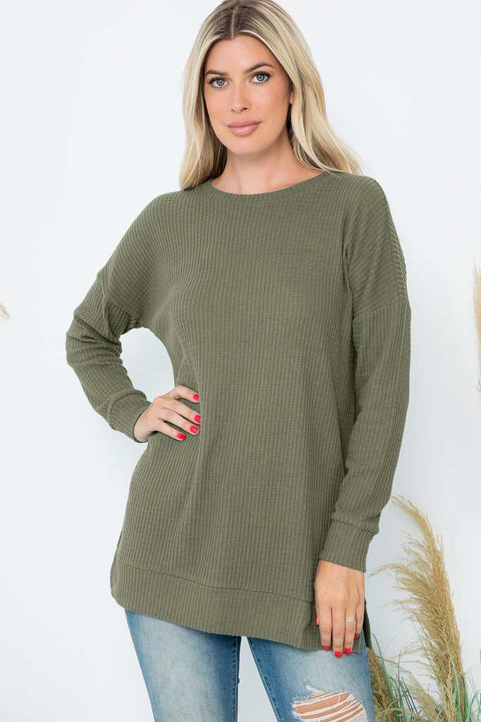 Elevate your everyday wardrobe with this brushed waffle sweater, designed for effortless sophistication. The soft, textured fabric offers cozy comfort while the classic round neckline keeps styling simple and timeless. Strategic side slits add a modern edge, allowing for easy movement and a flattering silhouette that works beautifully layered or worn solo. Perfect for transitional seasons, this versatile piece pairs seamlessly with jeans, skirts, or trousers for countless outfit combinations. Invest in a sweater that balances comfort with contemporary style.