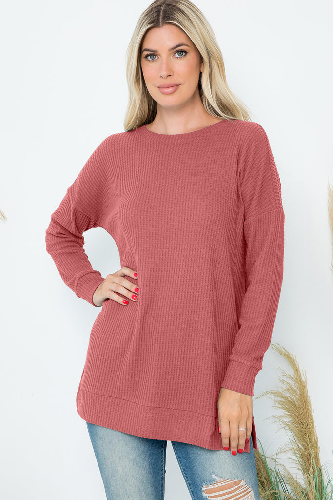 Elevate your everyday wardrobe with this brushed waffle sweater, designed for effortless sophistication. The soft, textured fabric offers cozy comfort while the classic round neck provides timeless appeal. Strategic side slits add a modern edge, creating subtle movement and visual interest with every wear. Perfect for layering or styling solo, this versatile piece transitions seamlessly from casual weekends to polished office days. Invest in a sweater that combines comfort, style, and contemporary design—a wardrobe essential that works as hard as you do.